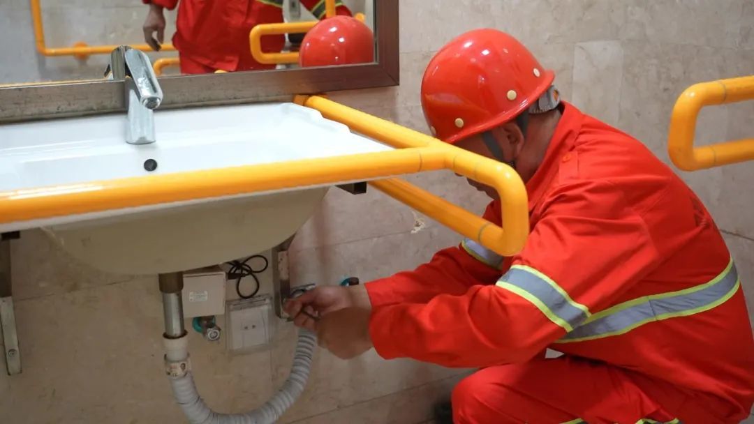 工人对无障碍卫生间的扶手进行加固