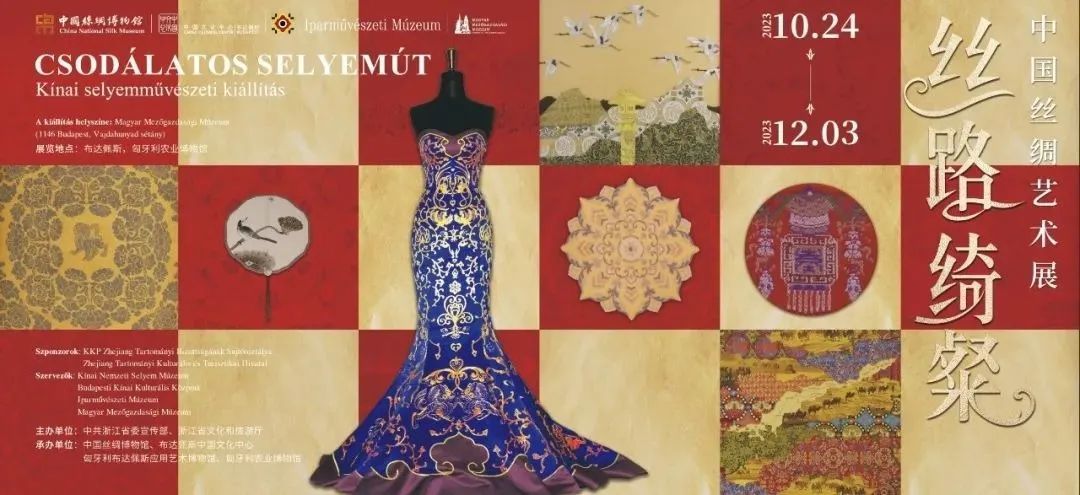 “丝路绮粲——中国丝绸艺术展”由浙江省委宣传部、浙江省文化和旅游厅主办,中国丝绸博物馆联合布达佩斯中国文化中心、匈牙利应用艺术博物馆、匈牙利农业博物馆共同承办。该展览于10月24日至12月3日在匈牙利农业博物馆持续面向观众开放,以“丝绸与丝路”“古代丝绸纹样”“当代活化应用”三个篇章,用60套/80件古代丝织物复制品和当代服饰艺术品,系统展示中国丝绸艺术的多元发展。