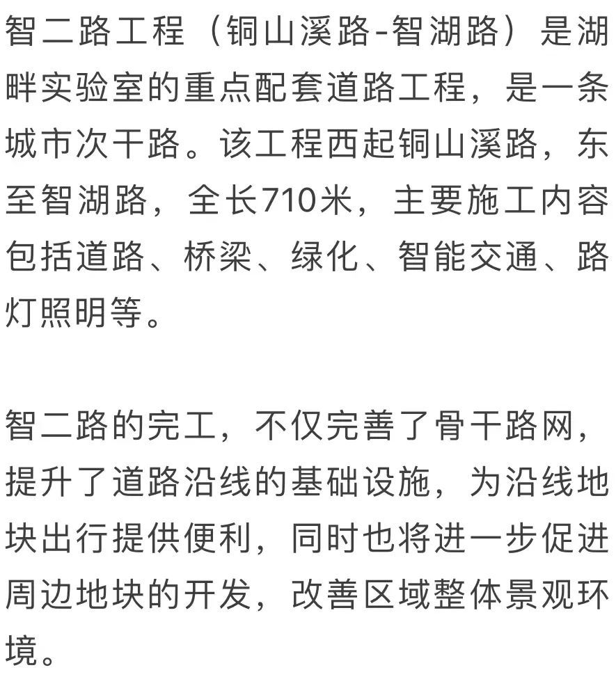 铜山溪路工程、智二路(铜山溪路-智湖路)、智湖路工程三条道路围绕湖畔实验室建设。