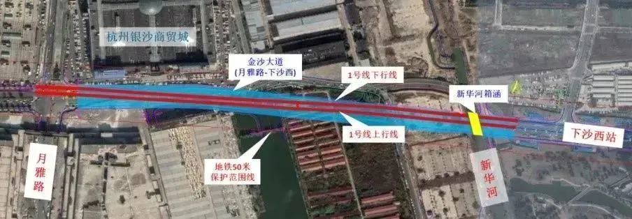 该项目东起下沙西地铁站,西至月雅路,道路标准段宽50米,全长约880米,采用双向六车道,主要建设内容包括道路、管线、绿化及新华河箱涵工程。目前正处于道路基层施工阶段,已完成总工程量的55%,计划于2024年7月建成。