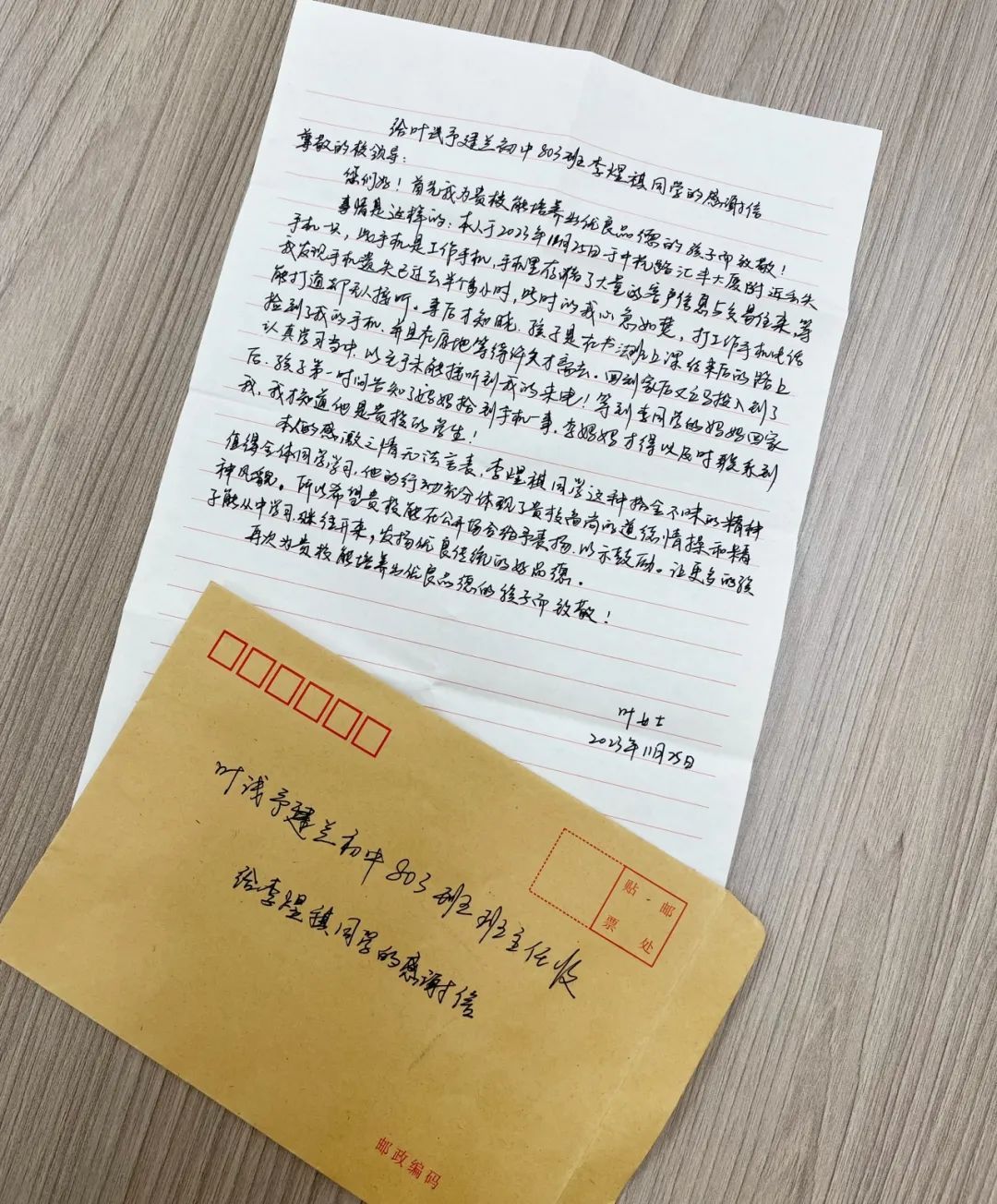 11月27日上午,一封手写的感谢信被寄到了桐庐县叶浅予建兰学校803班班主任的手中,信封上写着“给李煜祺同学的感谢信”。