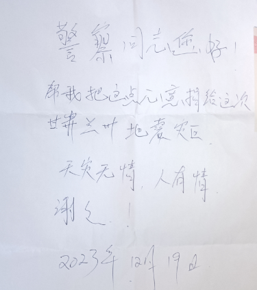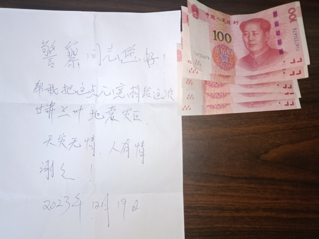 纸条上写着:“警察同志您好!请帮我把这点心意捐给这次甘肃地震灾区。天灾无情人有情,谢谢!”