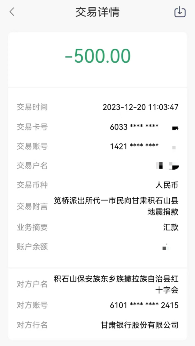 这次,教导员程建喜得知情况后,查询到甘肃积石山县红十字会的公开捐款账户,并让派出所工作人员按照匿名爱心人士的意愿,将这份爱心送到了甘肃地震灾区。