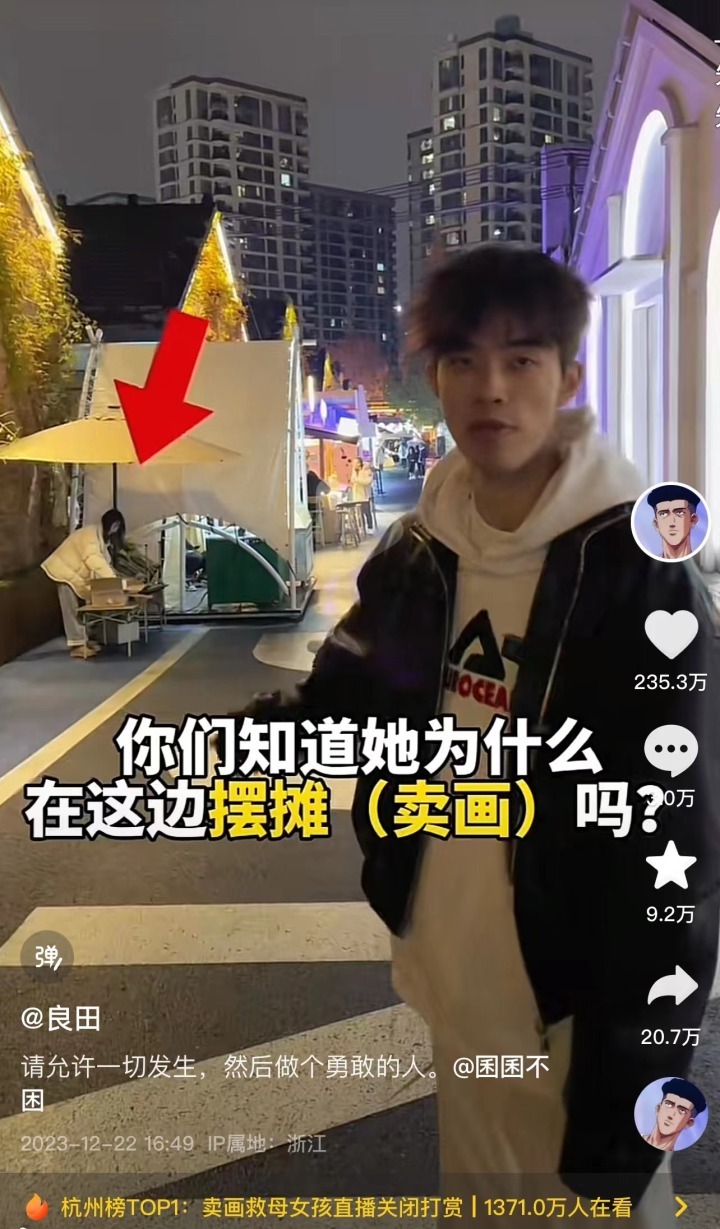 “那个曾经躲在屋檐下的小女孩,现在变成(妈妈的)屋檐了。”12月22日,抖音千万粉丝网红“良田”发布了一则视频,视频的主人公正是潮新闻一直关注的摆摊卖画为母亲挣医药费的小罗。