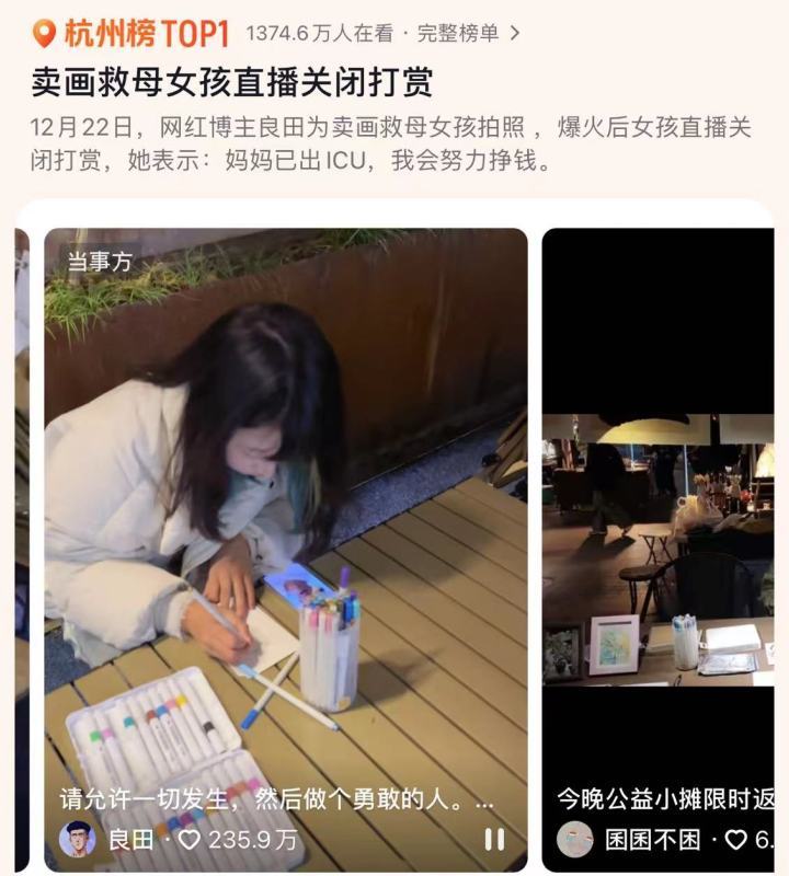 “卖画救母女孩直播关闭打赏”这一词条迅速火上热搜。粉丝也暴涨到了30万。
