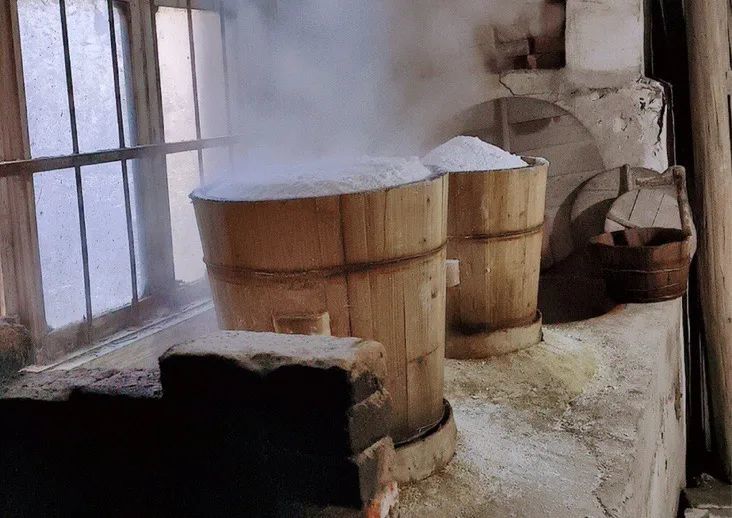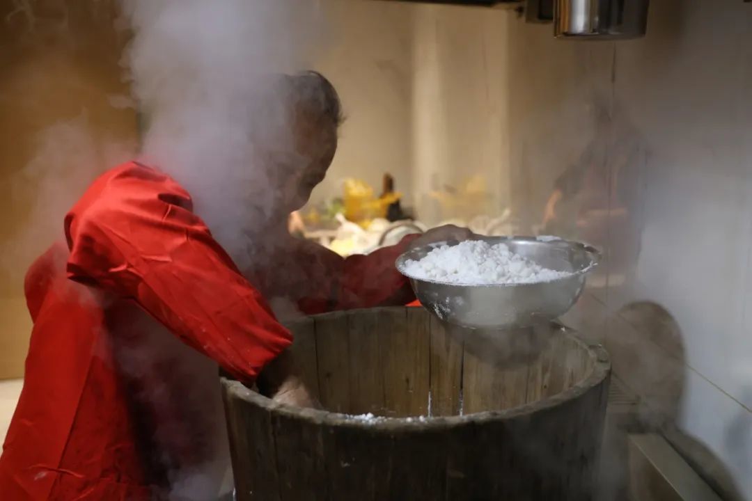 制作手工年糕需要九道工序,分别是浸米、磨粉、压榨、沥水、搓粉、上蒸、蹭捣、做糕、晾干,其中最关键的是搡年糕。必须两个人,一人搡,一人手浸冷水,快速地翻热米团。待到米团变得发黏,就迅速分成一颗颗粉团,用印糕板印制成一块块年糕。