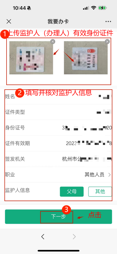 须法定监护人持二代有效身份证原件、申请人(卡主)有效身份证件(二代身份证或户口簿)原件以及监护关系证明原件(如出生证明等),具体证件要求需遵循卡片合作银行相关规定。