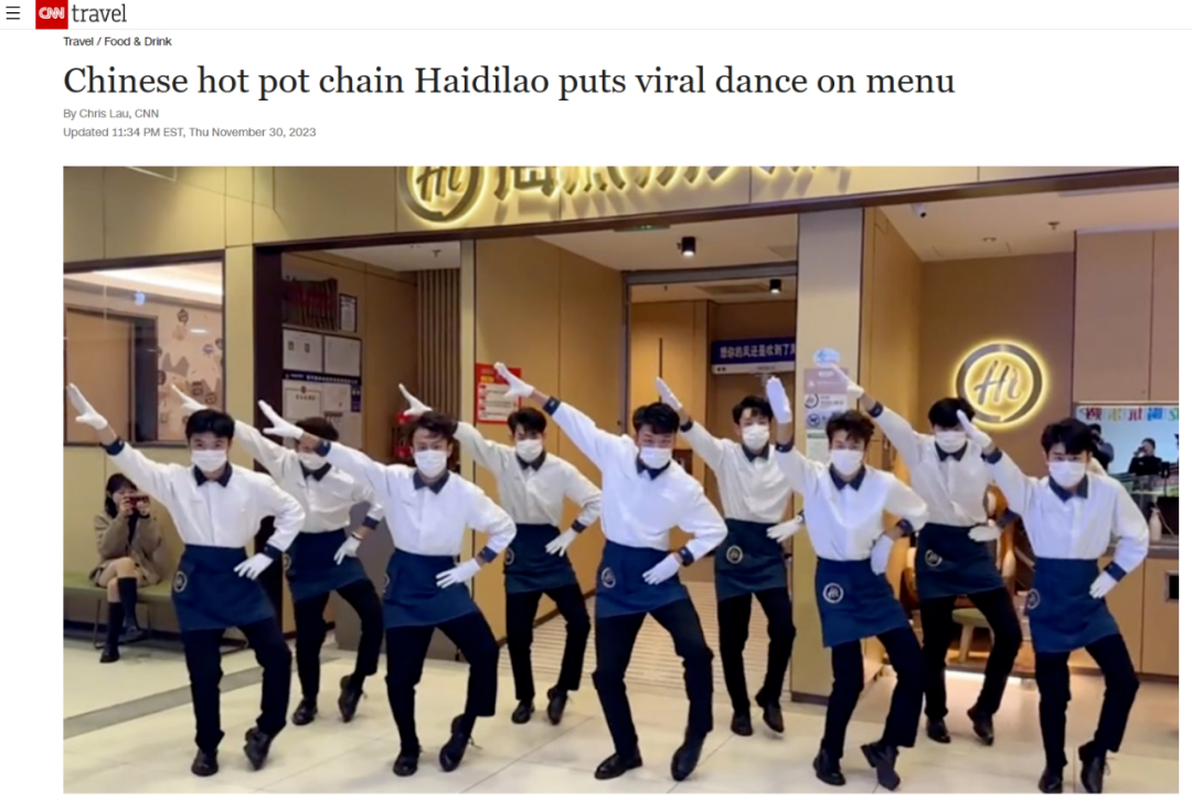 美国有线电视新闻网CNN在针对海底捞“科目三”的报道中将其描述为“西方迪斯科节拍和中国传统民谣的混合体” 图源:“中国日报双语新闻”微信公众号
