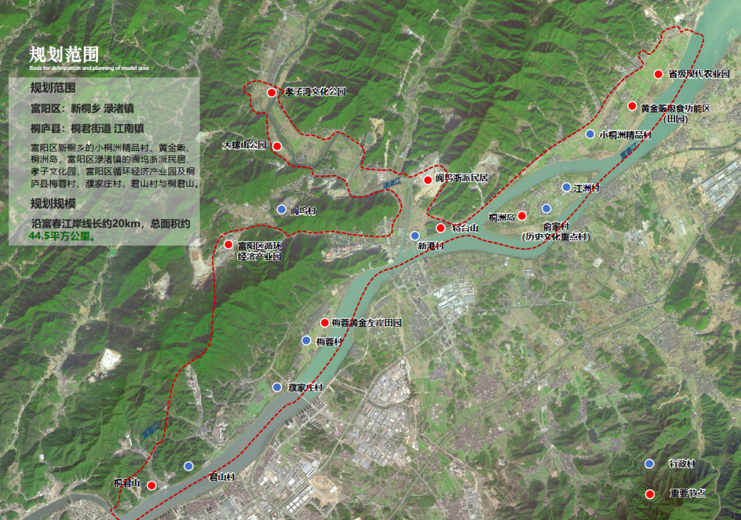 富阳-桐庐“富春田园牧歌”县域风貌样板区位于桐庐与富阳的交接地带,涉及富阳段的新桐乡和渌渚镇、桐庐段的桐君街道和江南镇部分地区。西至桐君山,东至新桐乡新店村,北至渌渚孝子湾文化公园,南至桐洲岛。