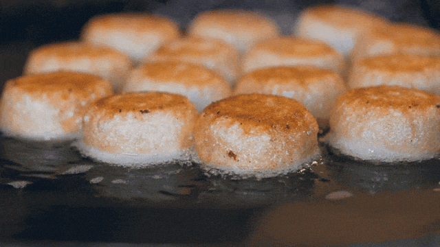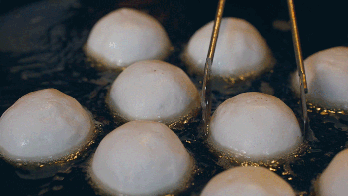 刚出炉的油墩子,看起来朴素,其实内有乾坤。桐乡的油墩子是用糯米粉制作的面团,揉成碗状,再放入用葱花、竹笋、鲜肉做成的馅料,搓成圆球状下锅油炸而成。