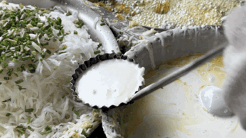 舀一勺面糊,倒入花型铁制模子晃匀,然后放入葱花萝卜丝,再舀一勺面糊铺在萝卜丝上面,随后放入油锅中烹炸。略微等待几秒,把模具在锅边轻轻一敲,成型的萝卜丝饼便完美“脱壳”,滑入翻滚的热油中。听着“滋啦滋啦”的声音,一个黄灿灿、香喷喷的萝卜丝就炸好了。