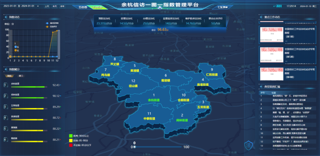在驾驶舱中,每个镇街、部门信访工作机制建设、履职能力等情况一目了然,通过6个主模块、32个数据指标,客观、精准、动态化反映全区试点推进情况。