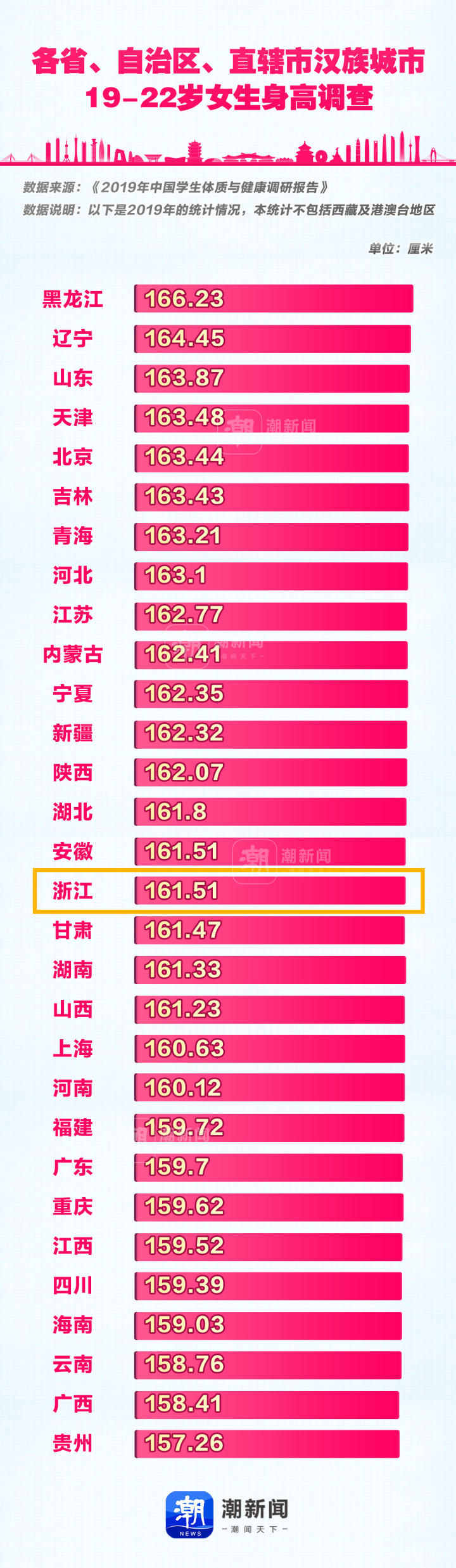 “北方最高”黑龙江与“南方最高”江苏省之间,男生身高的差值为2.69厘米;而南北方的“副班长”河南省和贵州省之间,差值则为3.52厘米;