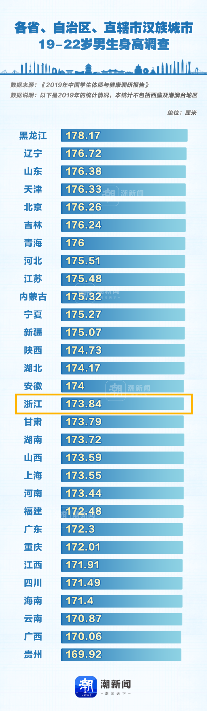不仅前三被北方省份“包圆儿”了,甚至放眼前十,也只有江苏这一棵南方“小独苗”——江苏男生以175.48厘米登上“南方之巅”,排在全国第9;紧随其后的则是湖北省和安徽省,男生平均身高分别为174.17厘米、174厘米,分别排在全国第14、15名。