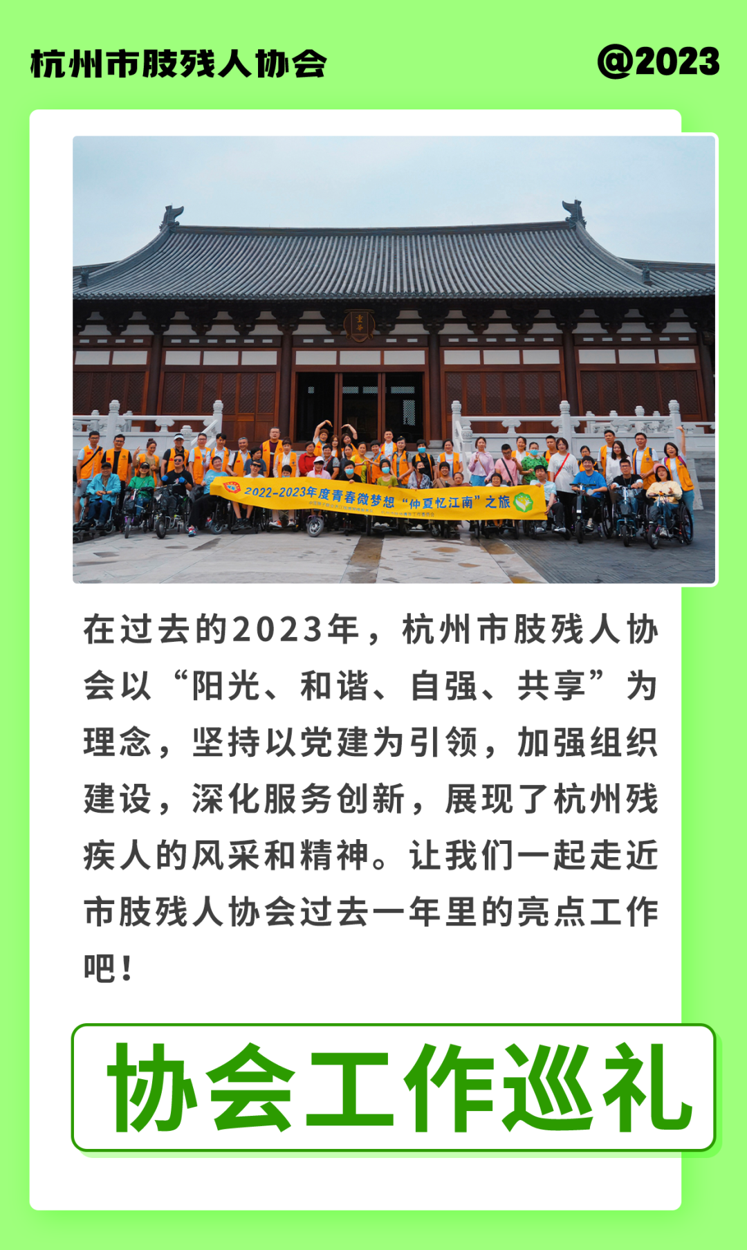 同时,积极组织肢残人士参加各类文体活动,2023年,组织参加体育比赛和文化演出20余场次,外出旅游、交流10余次,惠及肢残人士2000人次,有效地提升了肢残人士的生活质量和幸福感。
