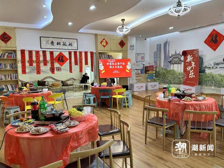 社区中心内的大厅,四桌年夜饭已经摆上了茶点和饮料、火锅。
