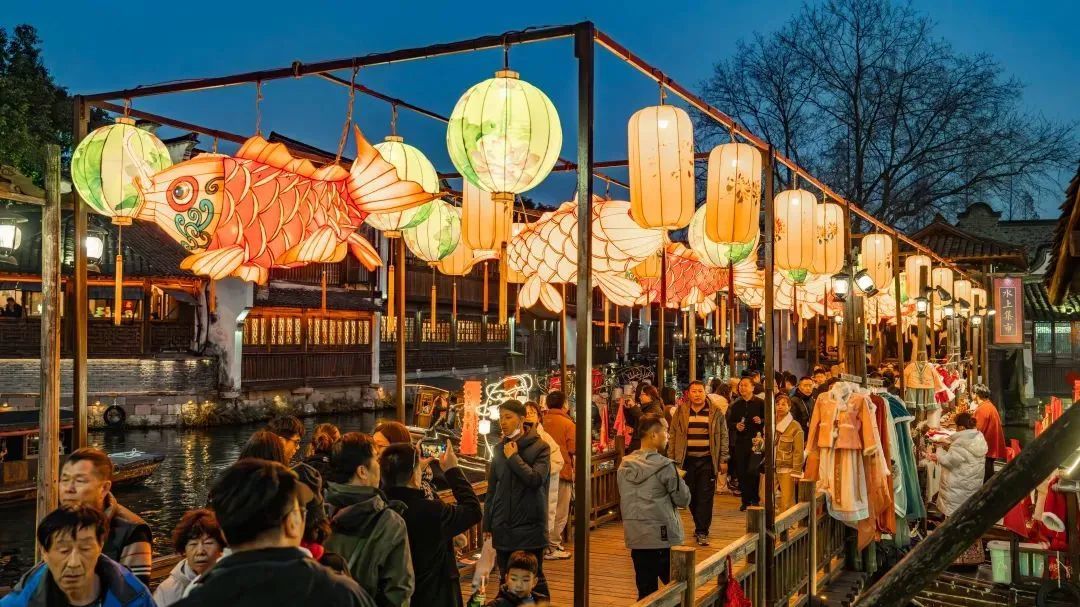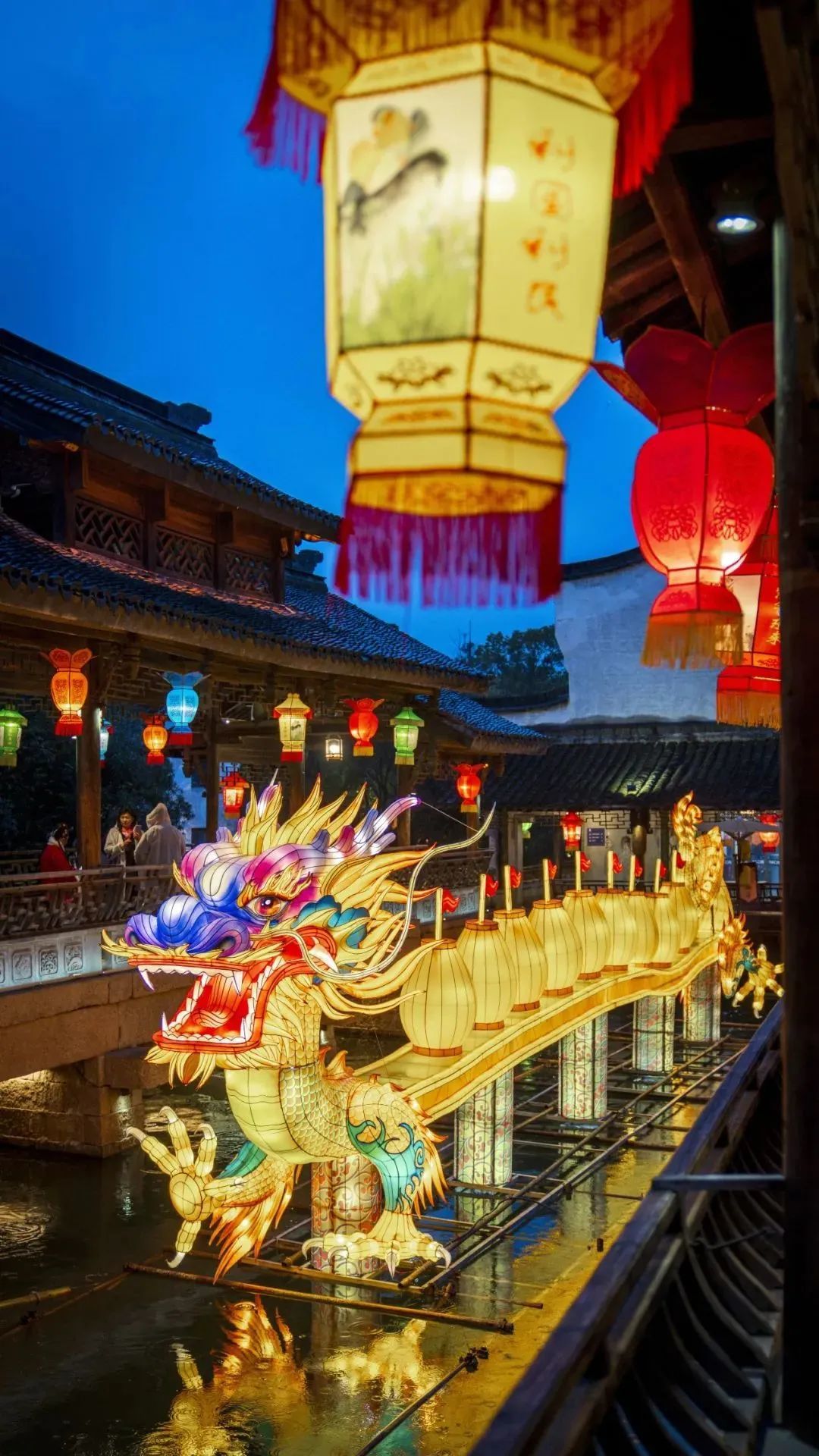 万家灯火团圆时,乌镇景区“龙”光焕发。春节期间,盛大的“龙行乌镇水上年”系列活动还原枕水人家的水上年味,吸引四面八方的游客来此欢度春节,到处洋溢着龙年新春欢乐氛围。