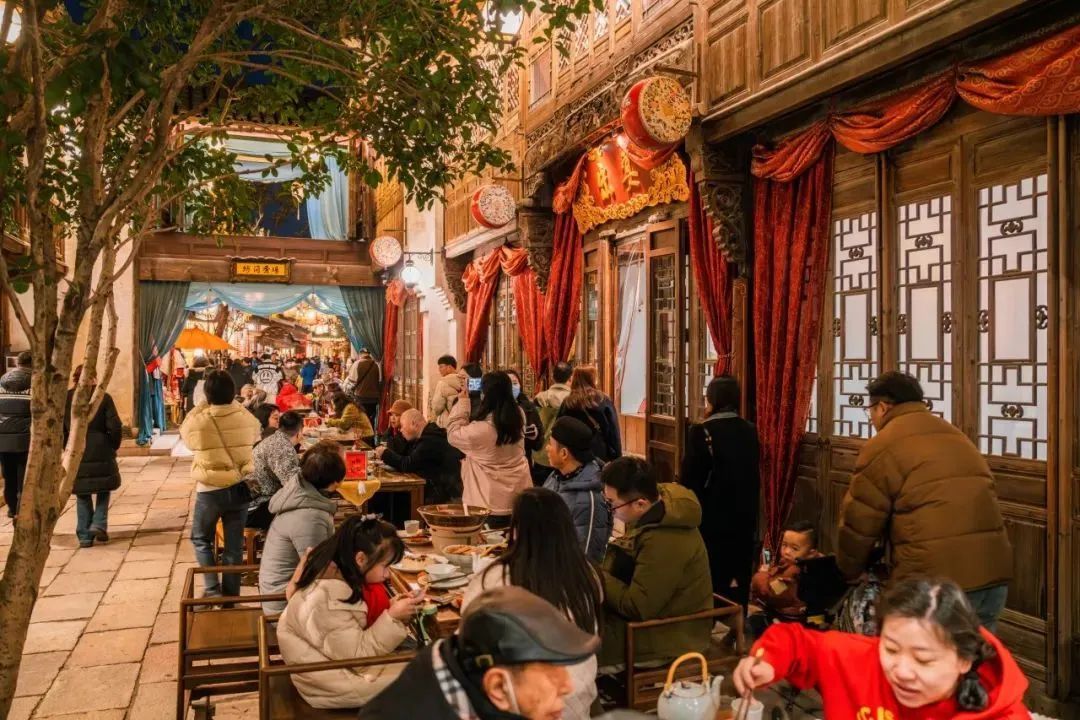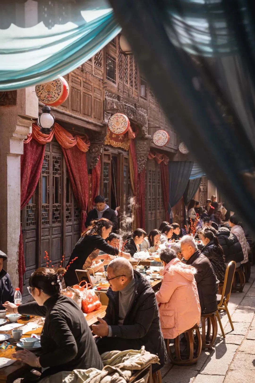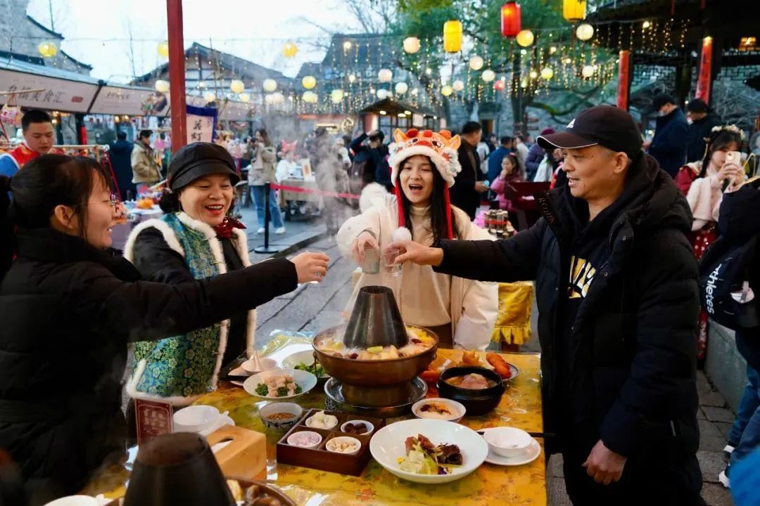 除夕当日,万众瞩目的长街龙宴向来自全国各地的游客开放,紫铜暖锅蒸腾着热气,食客围坐在两边,来自天南海北的游客共同享受着这顿特殊又江南味十足的年夜饭。