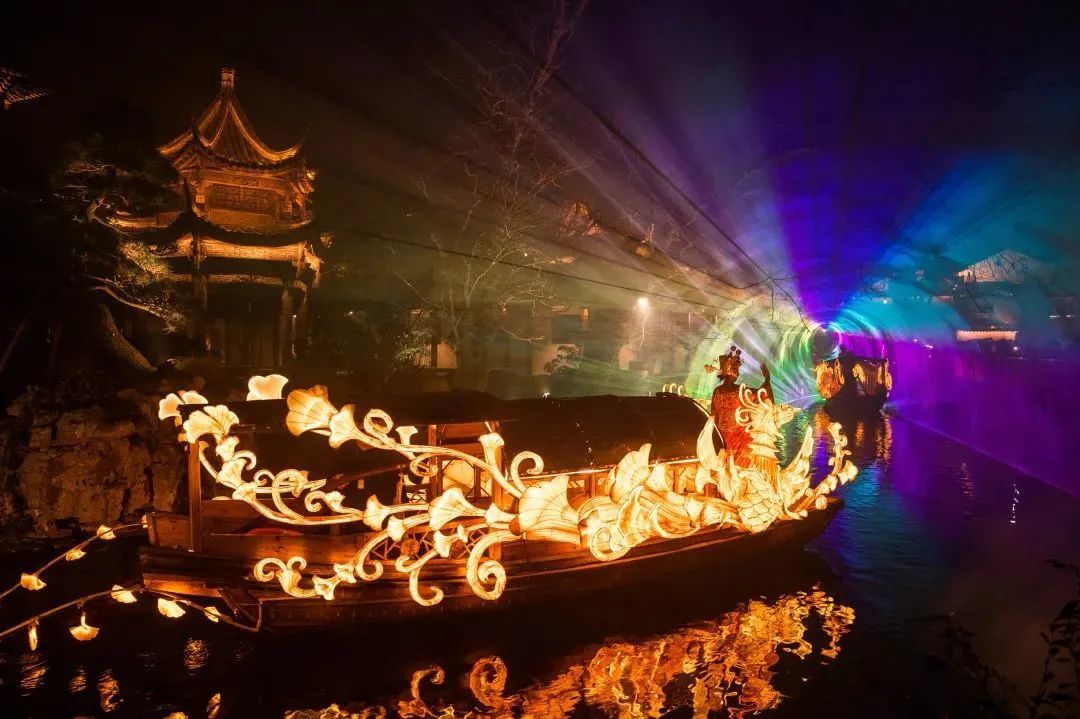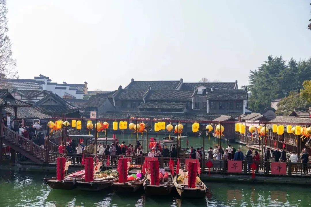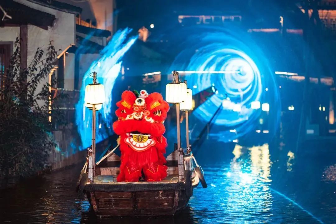 “新春水陆演绎”是本次新年活动的重头戏。摇橹船在送福巡游中摇身一变,换上龙年新装,载上福寿喜财龙,在碧波荡漾中开启送福巡游,年货船送福、花灯船亮福,为沿岸的人家和等候的游客洒下满满的祝福。
