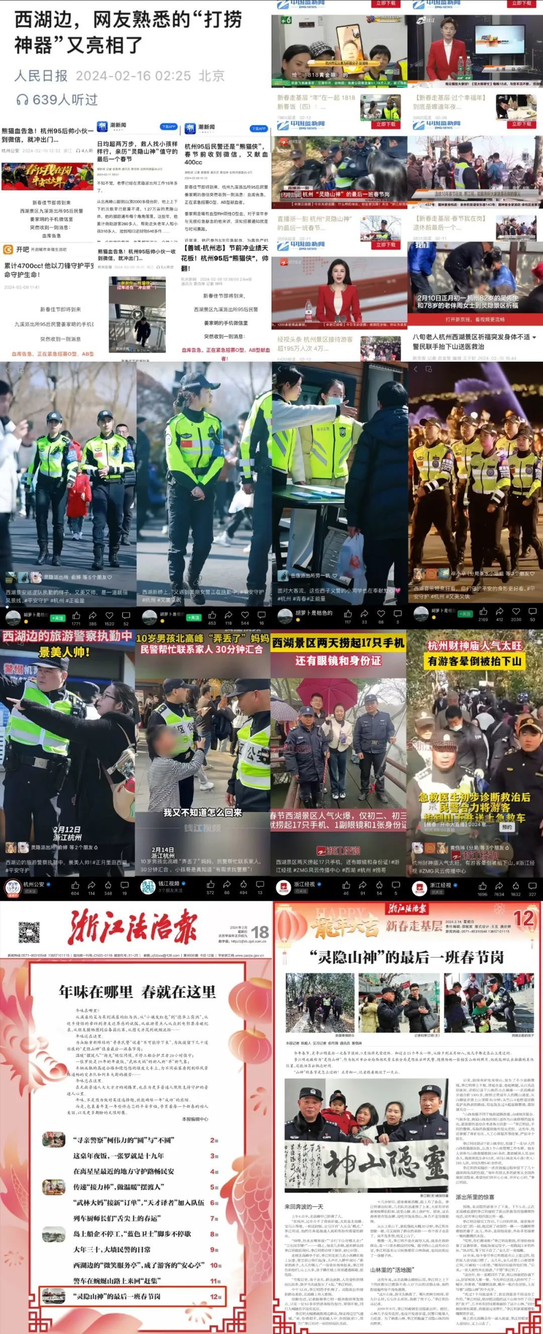 紧密围绕 “以‘警’守‘景’护团圆”主题,深挖先进典型,强化正面宣传。全体参战警力规范执法、热情服务,全方位开展咨询服务、反诈宣传、救援救助等工作, 共提供各类服务1.2万余次,救助受伤群众20余人,帮助寻回走失人员50余人、遗失落水物品30余件;“西湖捞哥”团队、“景安巡逻队”“灵隐山神”等热点话题在中央省市主流媒体宣传报道60余篇次,全体干警用“辛苦指数”“奉献指数”换取景区的“平安指数”和群众的“幸福指数”,擦亮了 “西子警队”品牌。
