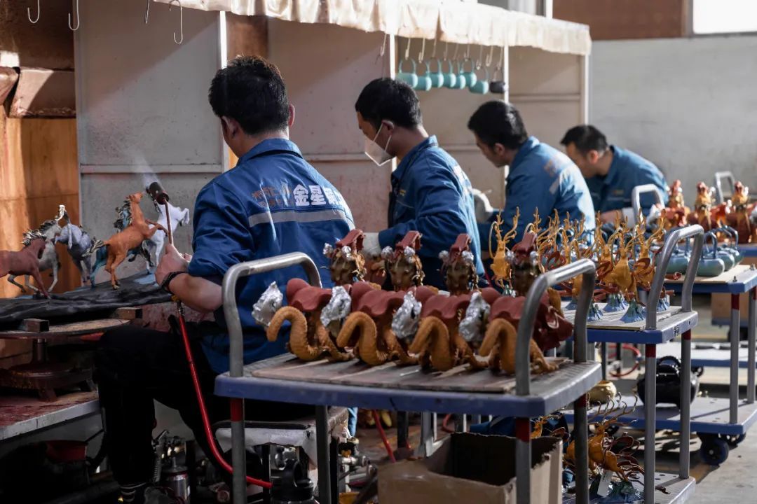 朱炳仁的龙年贺岁生肖吉祥物,今年又上了央视《甲辰春来 福暖四季》除夕特别节目(点击了解详情)。春节期间,龙年生肖铜艺摆件销售火爆。2月18日,朱炳仁·铜迎来了正式开工,生产制作车间繁忙一片,正在加足马力赶工制作春节期间的订单。