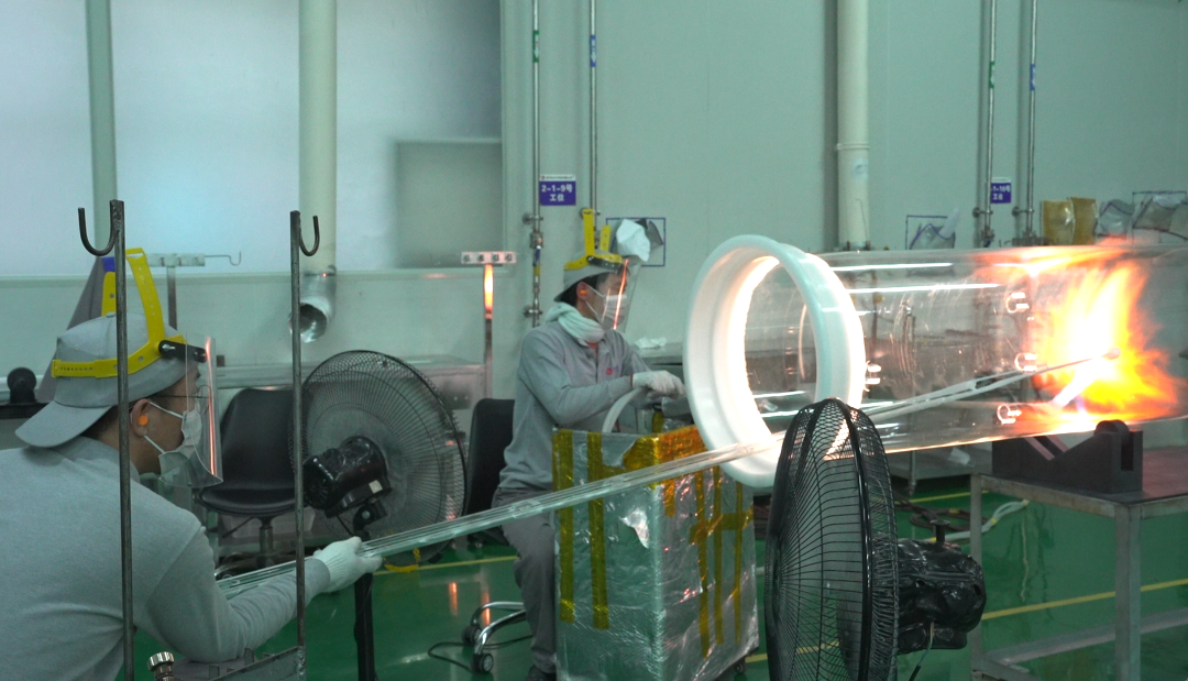 穿上鞋套来到热加工车间,记者隔着玻璃窗看到,工人在岗位上忙碌着。在热加工一室,3位工人手持氢氧焰喷枪,给一根大型石英管做火加工。这根3米多长、直径约50厘米的石英管,是光伏电池板加工工艺中使用的炉管,价值5万多元。另一位工人正在对着一根小型石英管做火加工。这根石英管是集成电路外延工艺中的一个核心部件,长90厘米、直径28厘米,价值达6万多元。配套集成电路的石英件,对材料纯净度、稳定性、尺寸精度等各方面要求都很高,单价也就更高。