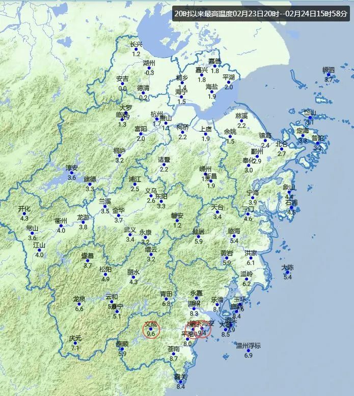浙北一带的最高气温几乎都被拦在3℃以下。点名“湖州”,算是彻底“冰封”了,截至24日15时58分,整一天的气温都没有成功爬上过0℃,最高-0.3℃。