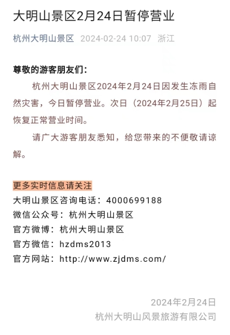 24日上午,“杭州大明山景区”发布暂停营业通知——