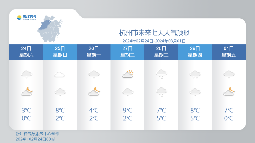 2月25日: 全省阴到多云;其中浙西和浙北地区夜里转阴部分有小雨,西北山区局部雨夹雪或小雪。