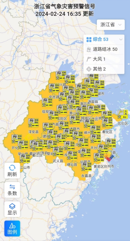 截至24日16时35分,全省共有50个道路结冰预警生效中。