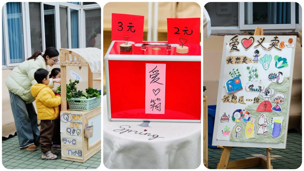 小朋友们将洗干净的蔬菜放整齐,放上自己制作的海报和爱心箱,我们准备开始义卖啦!