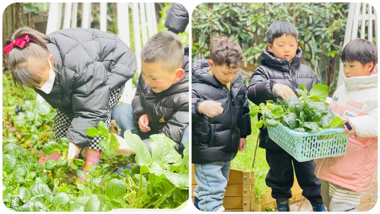 穿上套鞋、拿着小铲子小朋友们来到一亩菜园采摘自己种植的香菜和青菜,将它们放入筐中。