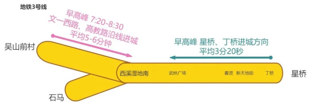 早高峰增投3列车,共线段星桥站至武林广场站方向行车间隔由平均4分钟加密至3分20秒,最短行车间隔3分钟,运能提升20%;支线段文一西路、高教路沿线进城方向,早上7:20-8:30行车间隔加密至平均5-6分钟。