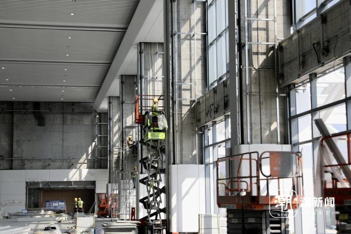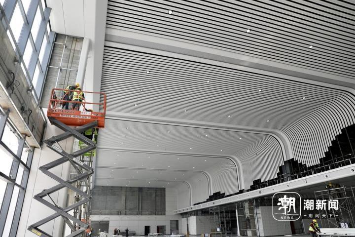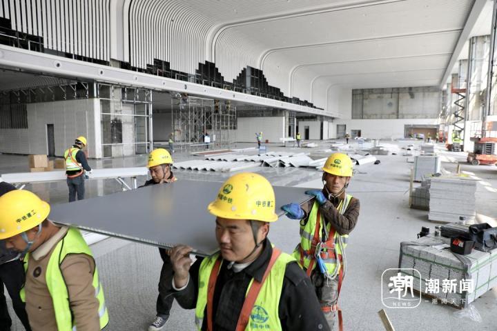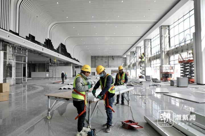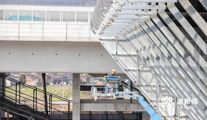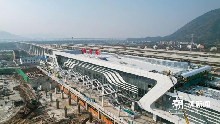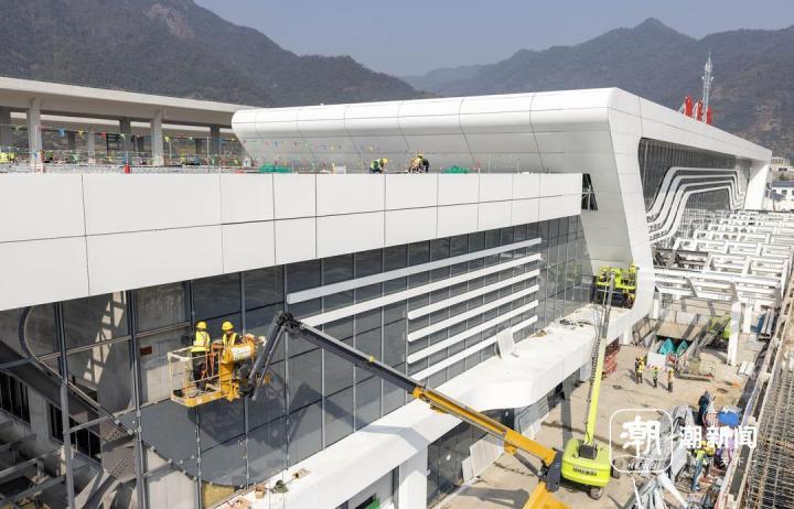 3月7日,在杭温高铁台州市仙居站项目施工现场,工人们正抢抓施工进度,确保工程如期完工。仙居站站房的设计理念为“高山流水、烟涛微茫”。建筑以“云纹”勾勒轮廓,并采用穿梭、叠落的手法形成立面元素,展示出建筑缥缈轻盈之态。
