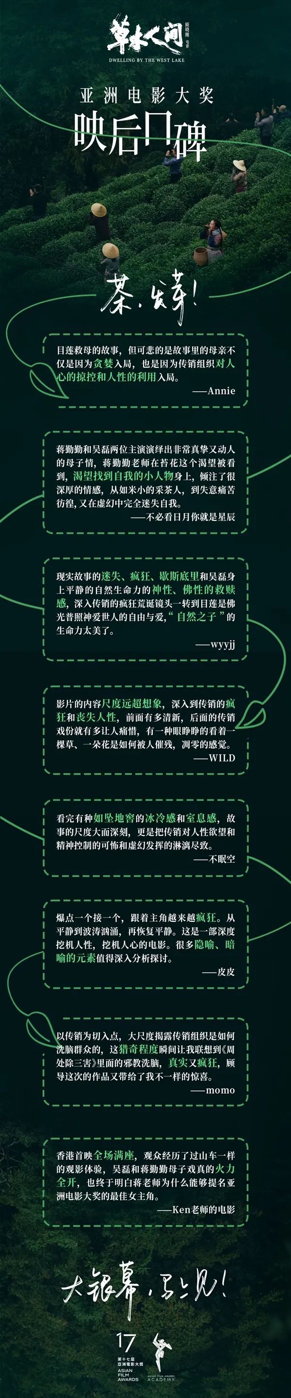 3月10日晚,第十七届亚洲电影大奖颁奖典礼在香港举行,16项大奖逐个揭晓。演员蒋勤勤凭借富阳导演顾晓刚执导的新片《草木人间》获得最佳女主角。此前,《草木人间》有三项入围亚洲电影大奖,分别是最佳女主角蒋勤勤、最佳导演顾晓刚和最佳原创音乐梅林茂。