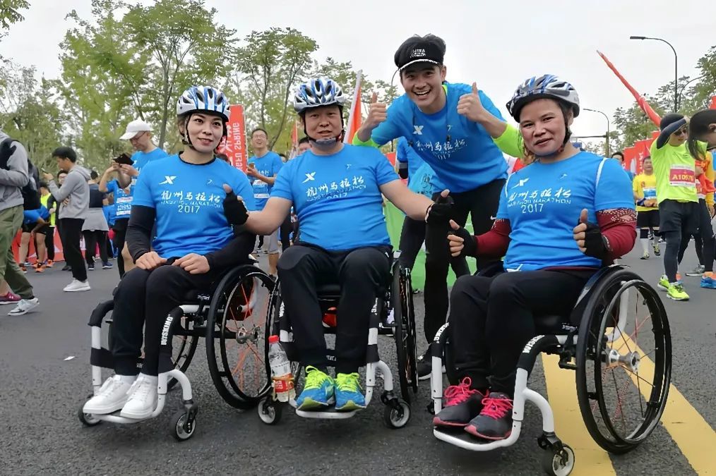这是一张拍摄于2017年杭州马拉松终点线处的合影。照片上,3位轮椅跑者与1位小伙在冲线后竖起大拇指为彼此喝彩。