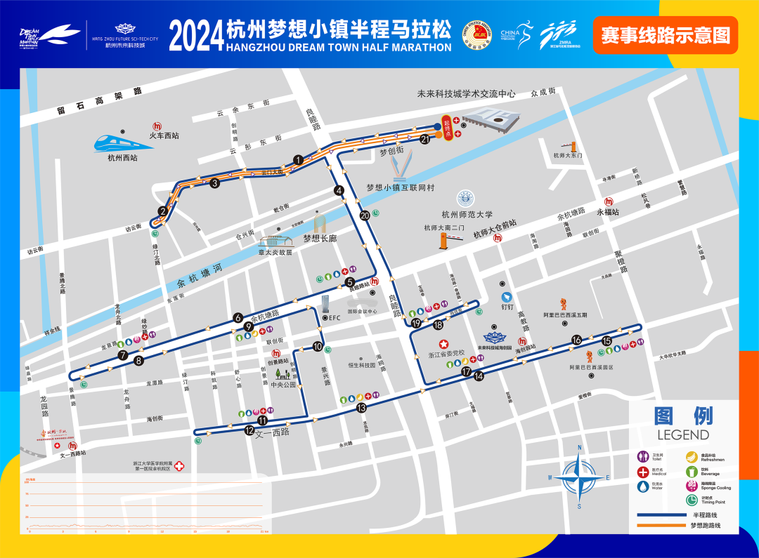 (一)半程马拉松:(起点)未来科技城学术交流中心东→梦创街→云门大街→访云街(绿汀北路折返)→访云街→云门大街→良睦路→余杭塘路(景腾路折返)→景兴路→向往街→创明路→文一西路(绿汀路折返)→文一西路(聚橙路折返)→文一西路→良睦路→向往街(海创路以西折返)→向往街→良睦路→梦创街→(终点)未来科技城学术交流中心东。