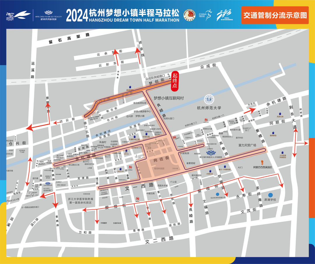 由杭州市余杭区人民政府主办,杭州未来科技城(海创园)管委会承办的2024杭州梦想小镇半程马拉松赛(梦马)将于3月31日(周日)在未来科技城学术交流中心举行。为确保比赛路线和周边道路交通安全、有序、畅通,根据《中华人民共和国道路交通安全法》第39条之规定,公安机关交通管理部门将在赛事期间对部分道路实施交通管制,现将有关事项通告如下:
