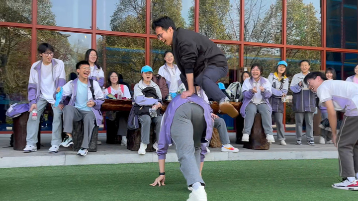 他们玩的是“跳山羊”游戏,男老师叫姜建业,42岁。是高二年级组长,也是这次研学的领队。