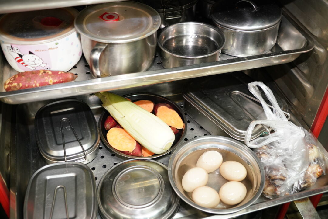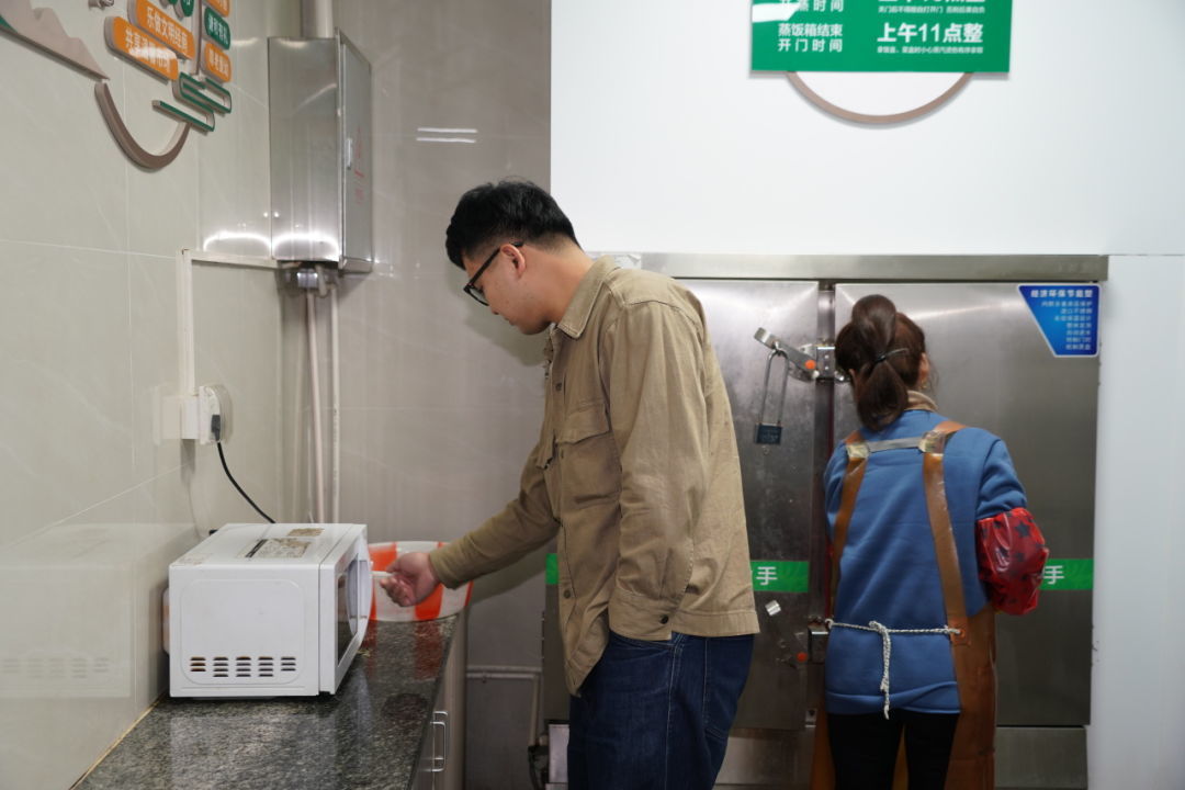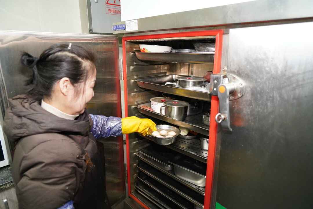 姚美珍到的时候,蒸箱内已经放了不少饭盒,她熟练地挑选着合适的位置,将自己的饭盒放入其中。“很方便,我每天都用。”说起这个公共厨房,她赞不绝口。