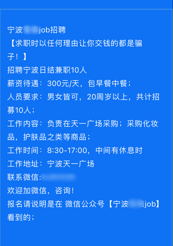 4月6日,小美在某求职招聘公众号上看到一则招聘“商场采购员”的兼职广告,工作要求挺简单,只需要前往商场帮忙“代购”一些化妆品、护肤品,就能拿到日薪300元的报酬,还包早午餐。看着这些“诱人”的条件,小美立即根据招聘广告上留下的联系方式,添加对方为好友。