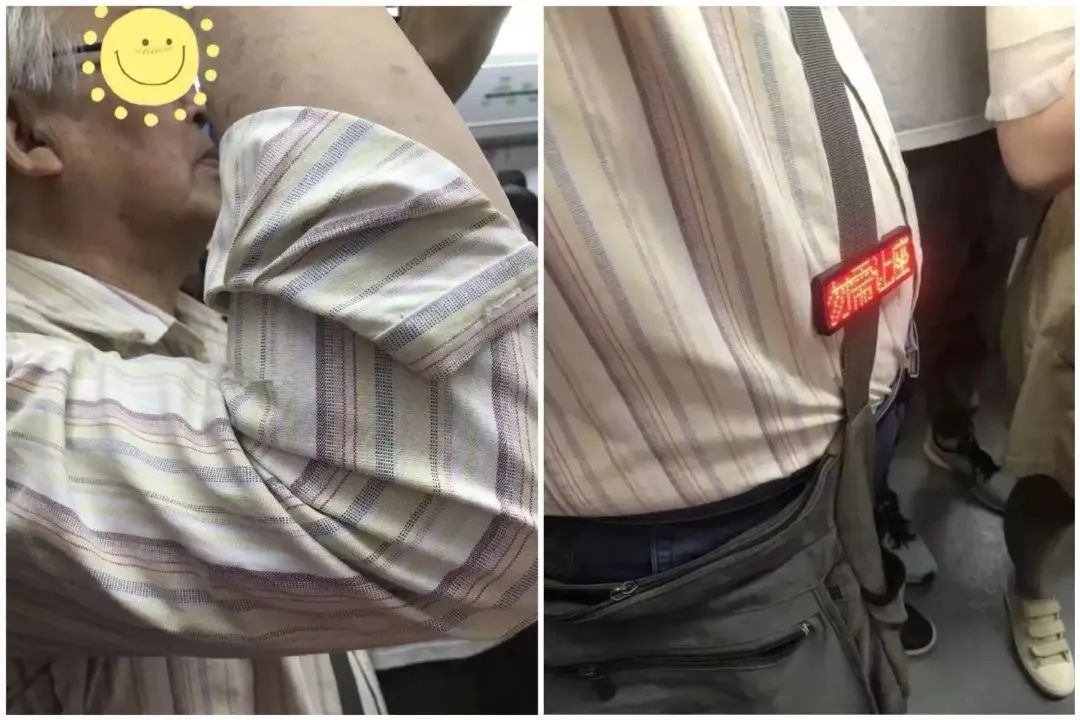 “硬核大爷”随身挂着“勿需让座”小牌坐地铁 图源:“人民日报”微信公众号