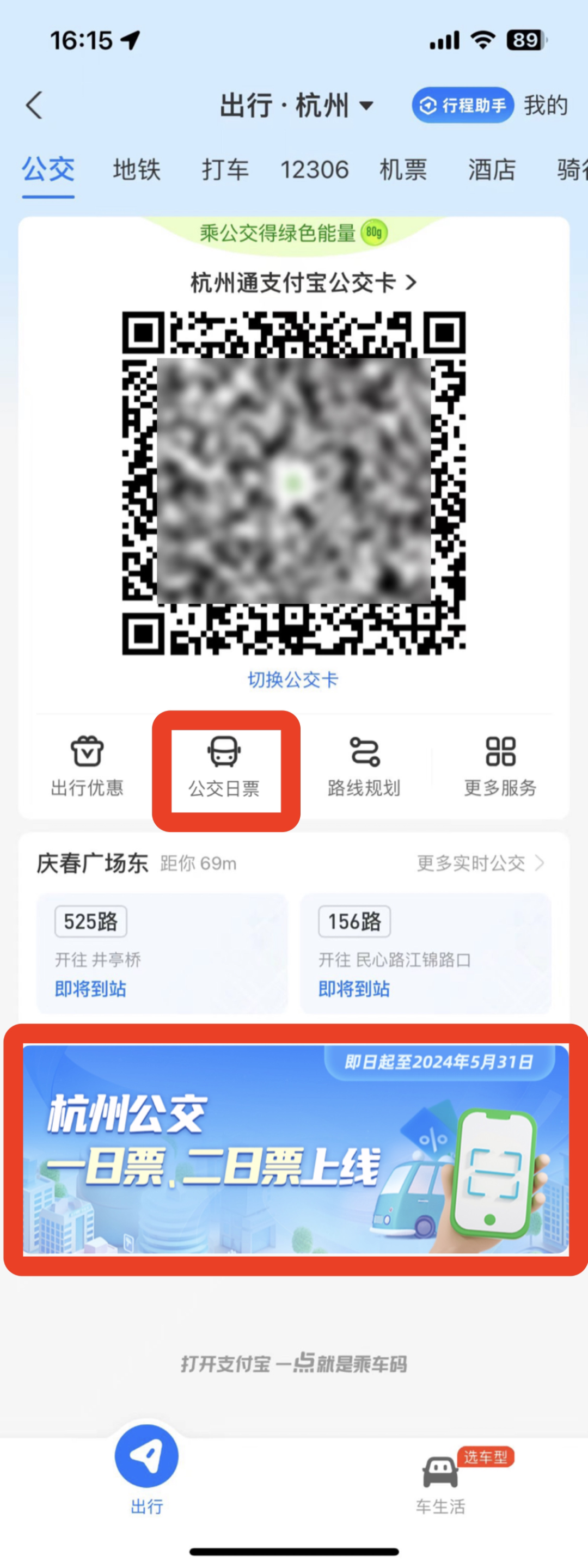 用户只需点击进入“支付宝APP—出行(定位杭州)—底部二维码下方【公交日票】”即可购买,购买后立即生效。