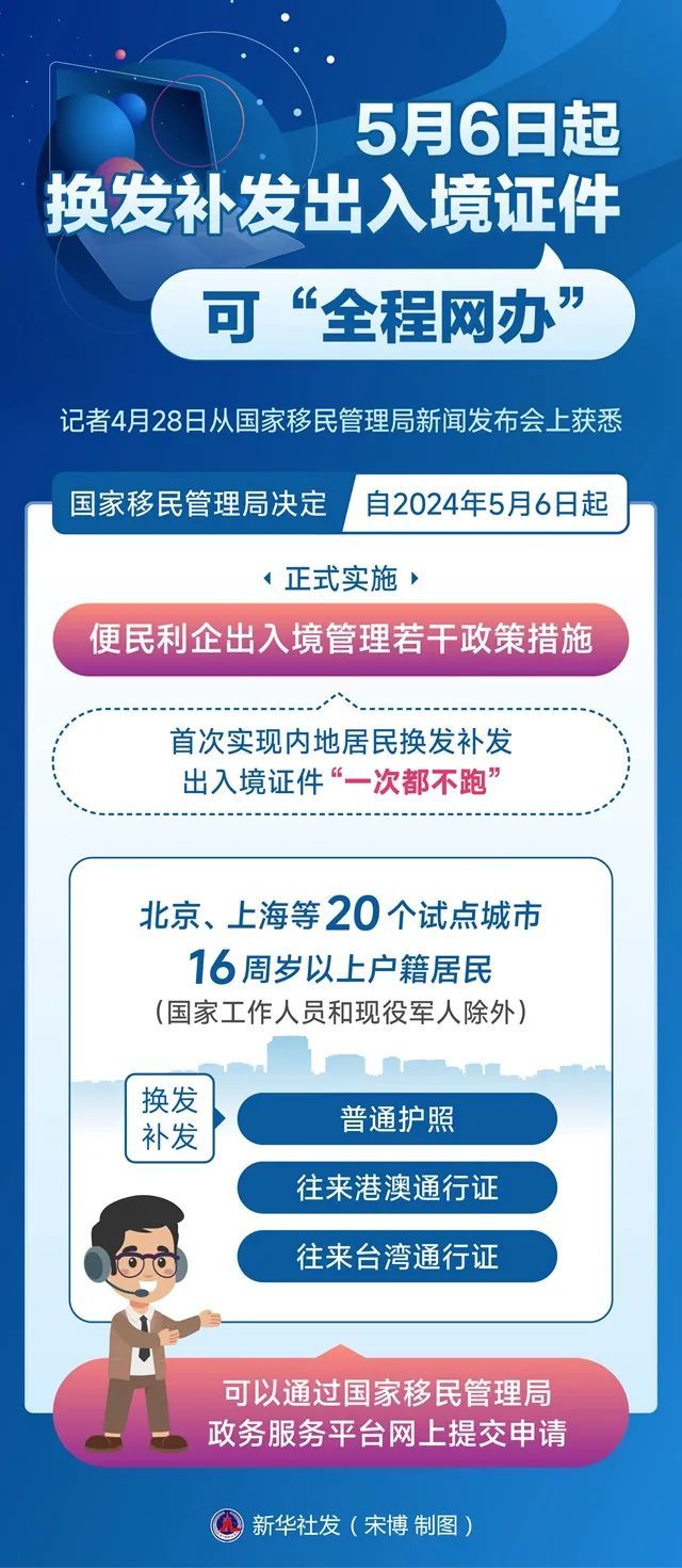 为更好地服务促进高水平对外开放,进一步便利内地人员出入境,国家移民管理局决定自5月6日起出台便民利企出入境管理六项政策措施。符合条件的申请人无需前往公安出入境窗口,在境内申请换发补发出入境证件不受时间、地点限制,实现了“掌上办、零跑腿”。