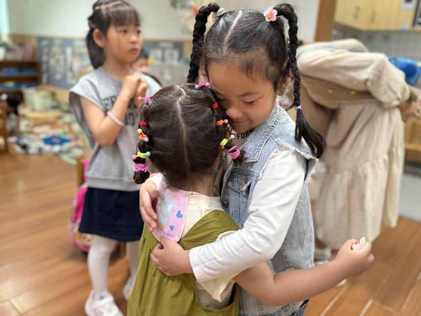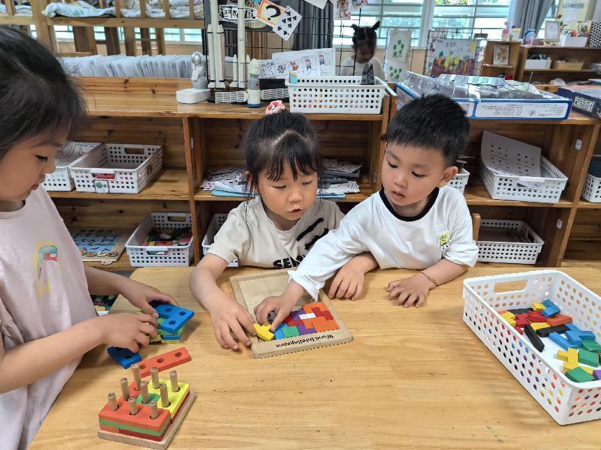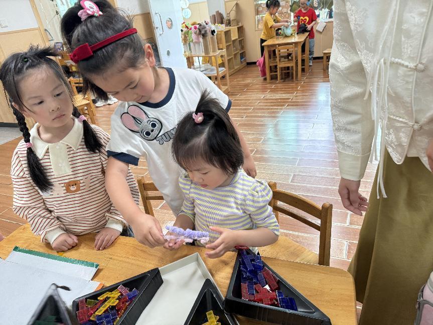 宝宝们一来到大班教室门口,就被热情的哥哥姐姐们迎进了班级,有的哥哥姐姐还精心给弟弟妹妹准备了见面小礼物。牵着哥哥姐姐们的手,宝宝们体验了各种区域游戏,搭一搭、画一画、转一转、拼一拼……小朋友、大朋友都玩得特别开心。