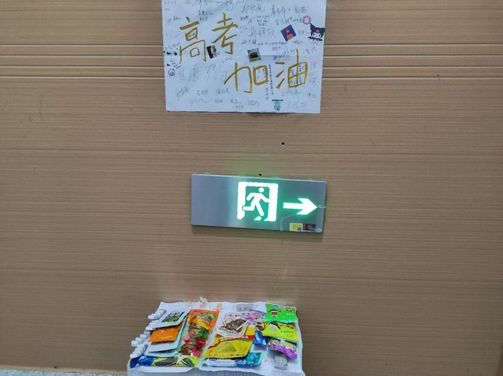 这里摆着一盘零食,墙上粘贴着一份“签名海报”,上面写着“高考加油”四个金闪闪的大字。