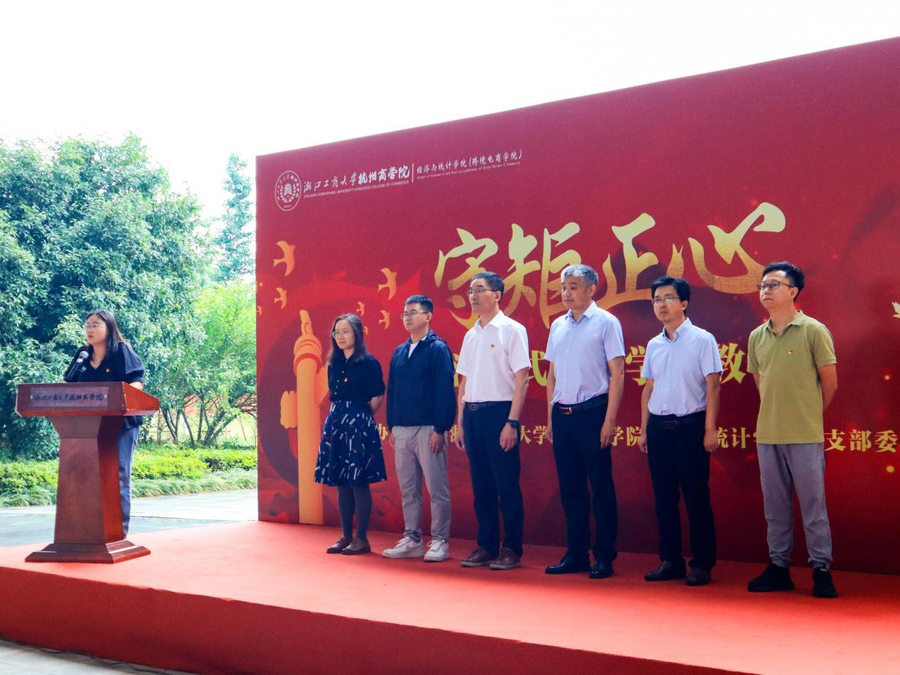 6月5日,浙江工商大学杭州商学院经济与统计学院(跨境电商学院)党总支(以下简称“经统学院党总支”)举行“守矩正心”沉浸式党纪学习教育暨启动仪式。浙江工商大学杭州商学院党委书记金锦华、党群工作部主任赵庆、纪检监察办公室主任竺华稀,经统学院党总支书记吕静、院长卢俊峰、党总支副书记费忠出席仪式,各师生党支部书记和师生党员代表参加。党总支纪检委员周敏娜主持。