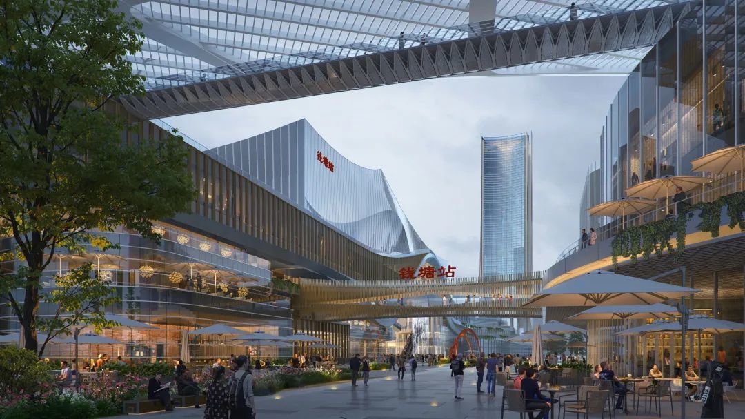 杭州交投集团与钱塘区政府围绕钱塘站实施站城一体融合开发,坚持便民实用导向,高质量建设杭州钱塘枢纽。目标是要建设一座“进站即花园、出站即城市、空间即潮流’的新型高铁站。”换句话说,钱塘站不仅会成为一个交通枢纽,还会与城市功能融合,配备有潮展厅、盖上公园、商业办公、酒店等多种城市配套功能,外围还将设置多功能产业社区、城市绿廊等。