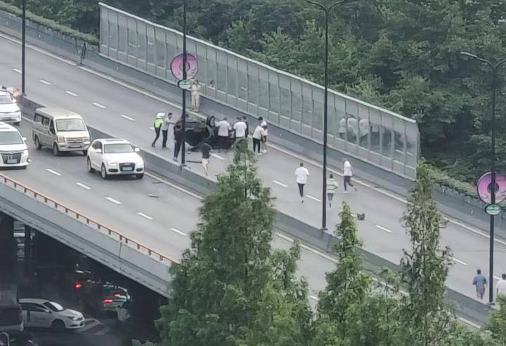 事发时,周袁正在附近岗亭和同事交接工作。突然,她看到高架上的对向车道车都停了下来,有人还下车站在路边。