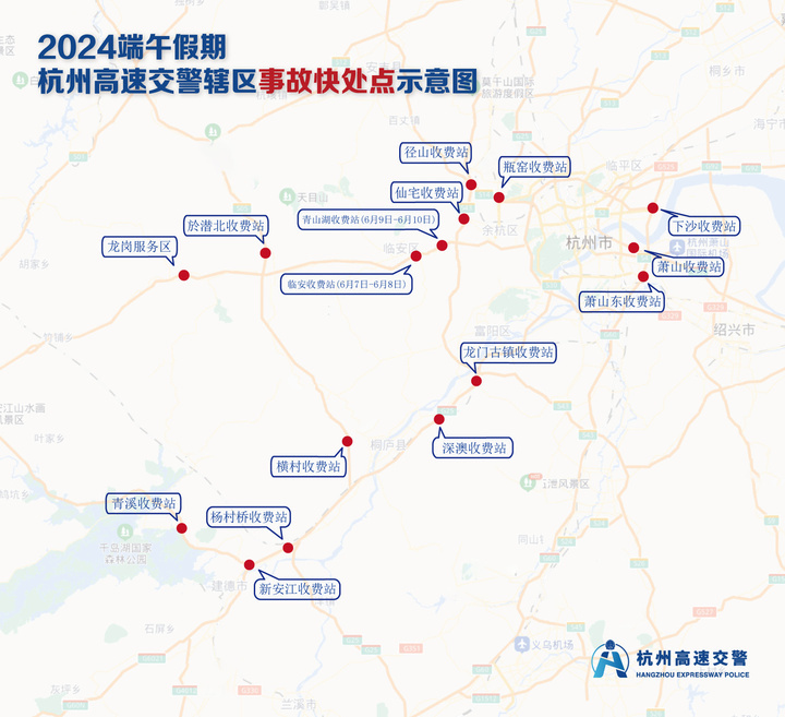 为更好方便群众,服务司乘人员,端午期间,杭州公安高速交警结合辖区流量和事故特点,设置事故快处点16处,G56杭徽高速临安收费站(6月7日-6月8日)、青山湖收费站(6月9日-6月10日)、龙岗服务区,G92杭甬高速萧山收费站、G60杭金衢高速萧山东收费站,G4012溧宁高速新安江收费站、青溪收费站,G6021杭长高速杨村桥收费站,S14杭长(宜)高速径山收费站、瓶窑收费站,S43杭州绕城西复线仙宅收费站,G25杭新景高速龙门古镇收费站、深澳收费站,G2504杭州绕城高速下沙收费站,S29临建高速於潜北收费站、横村收费站等,全力保障辖区高速公路畅通。